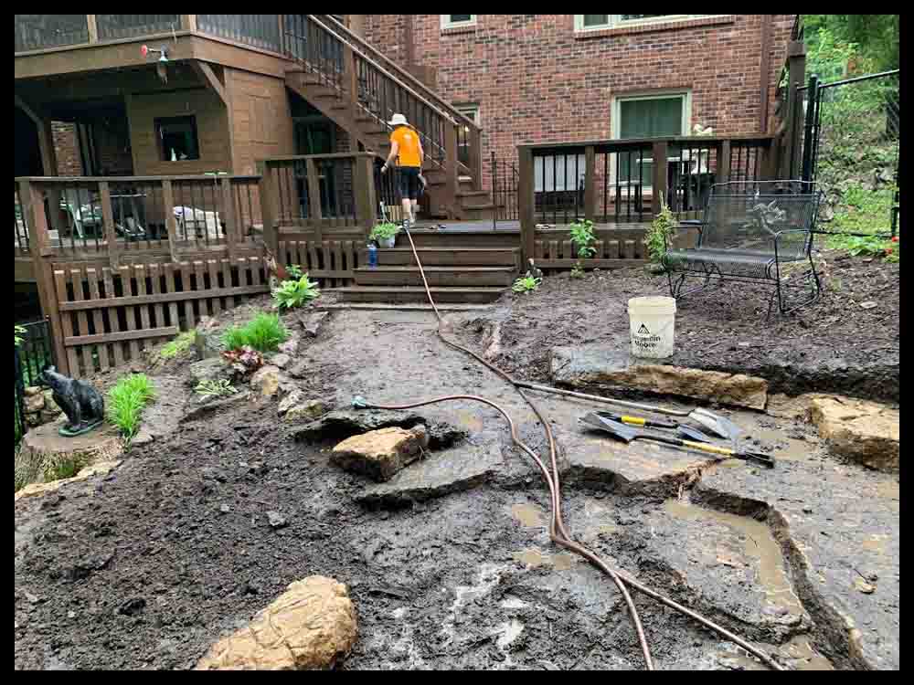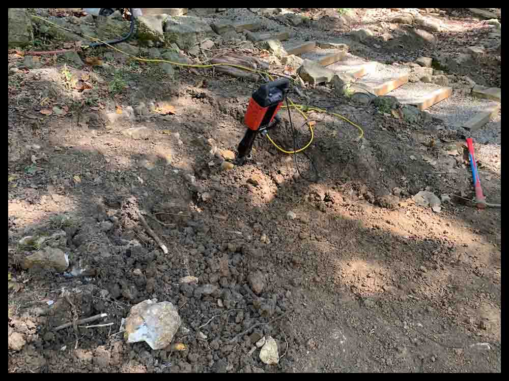 My wife had been bugging me for years to make the grandkids a swing set. Well, when the firepit was finished I took a good hard look at where I could put one. Our backyard is not exactly a toddlers paradise. I finally decided on a spot next to the steps that lead down to the bottom of the yard. I went to a nearby playground and measured how much room a person would need behind the swing to comfortably push a small kid. This was how much flat area we would need. It didn’t take long to figure out that we would be digging down nearly 4 feet at the back edge of the flat area. I knew from past experience that rocks and roots would be our nemesis. But I got out the pickaxe, shovels, and jackhammer and we started our project. Lets just say I’ve gotten my money’s worth out of the jackhammer purchase :-0