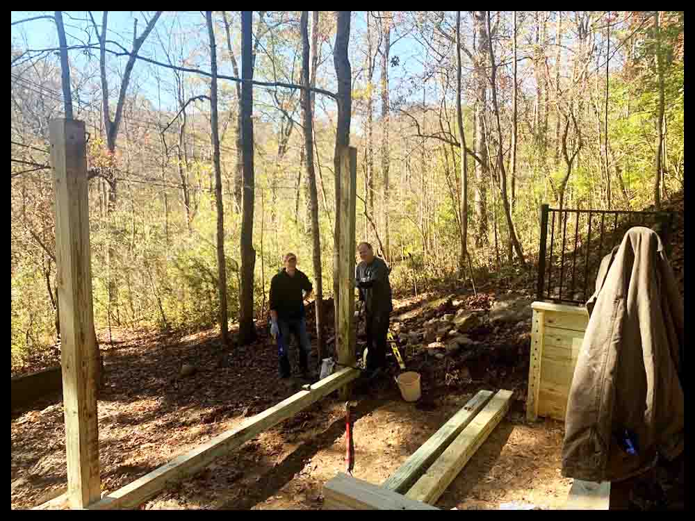 My first purchase was a pile of treated lumber from one of the local home improvement stores. Of course, when digging the three holes for the “tree”, I ran into rock, just as I had in our previous projects. I was going to sell the jackhammer but fortunately (or perhaps unfortunately) 🙂 I still owned it. So lugged it down the hill to the bottom of the yard to help dig three holes.