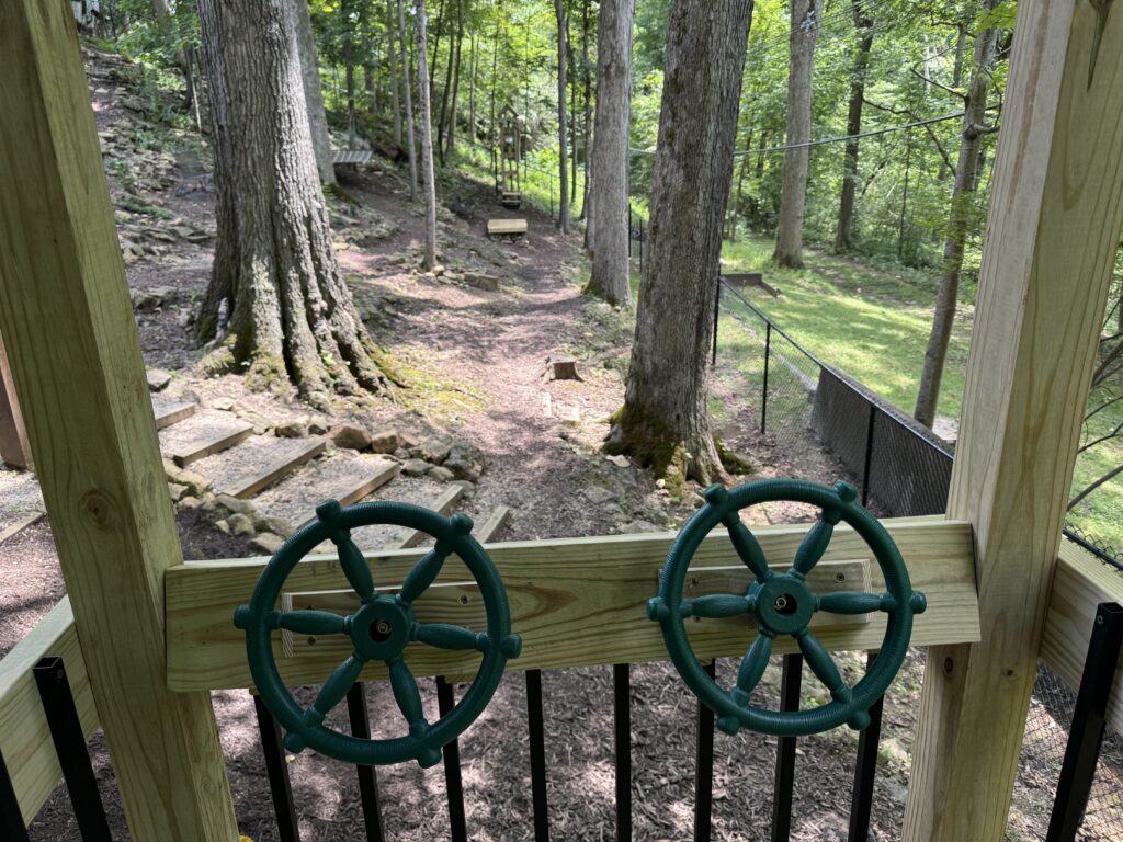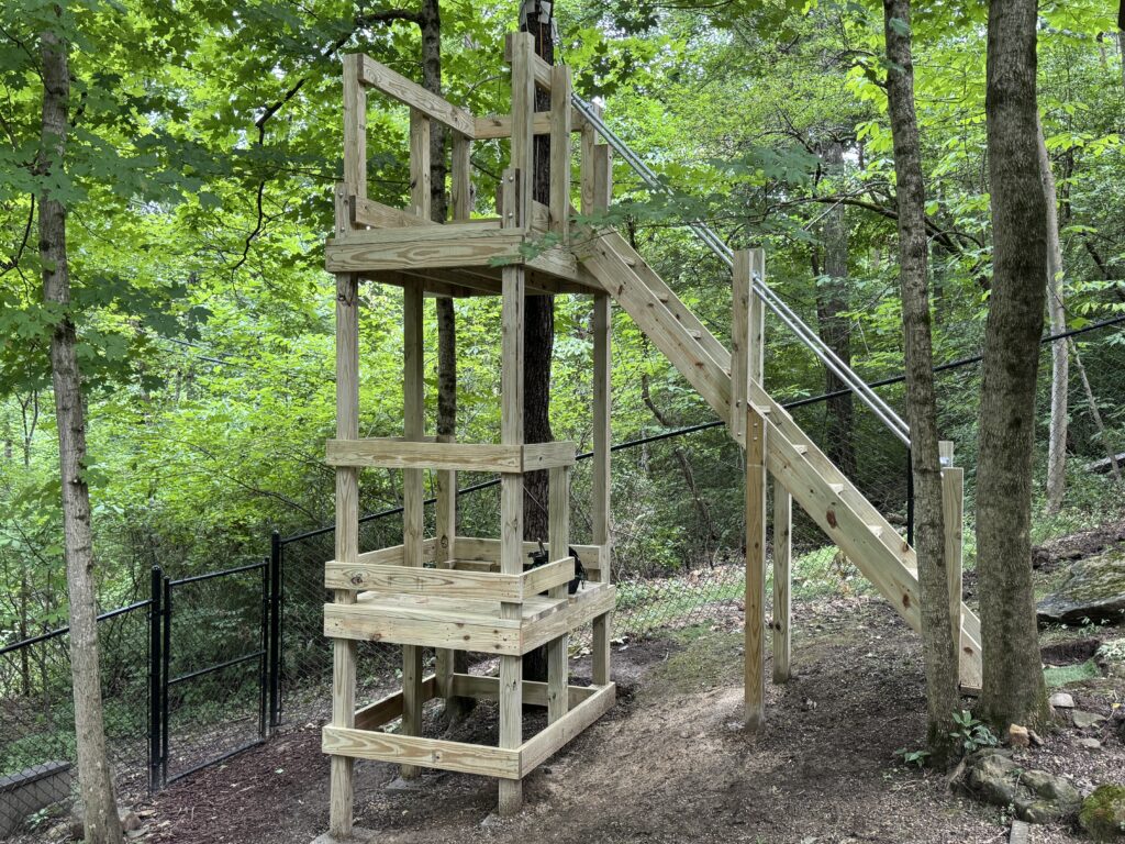 I didn’t die, however, but immediately my tool and die background kicked in and I decided everything would have to be bigger and stronger. The roof was added, along with handrails and better steps. I took the 3/16″ cable down and purchased a coil of 5/16″ stainless cable, along with a bigger turnbuckle that is used to tighten the cable to the proper tension. Next I added two “Bungee cord” ropes to augment the spring coil that served as the brake. Finally, after determining where a zipliner’s journey would end, I constructed a “landing” platform so a person could safely disembark after the ride was finished.