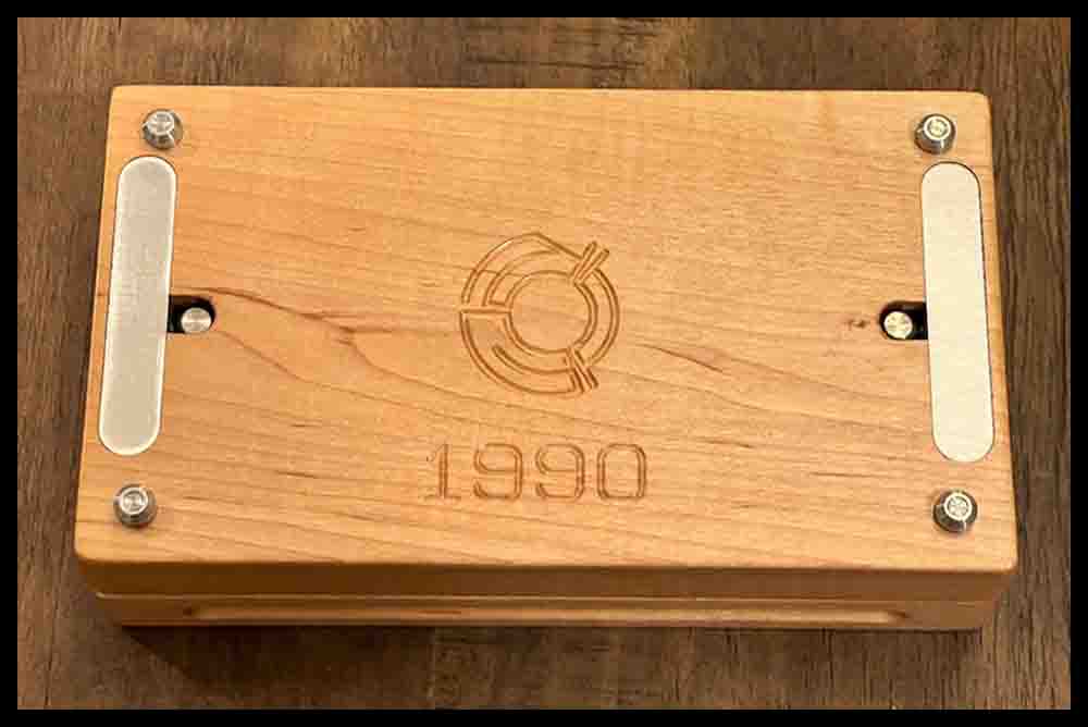 The top of the storage box with two boards engraved on them.