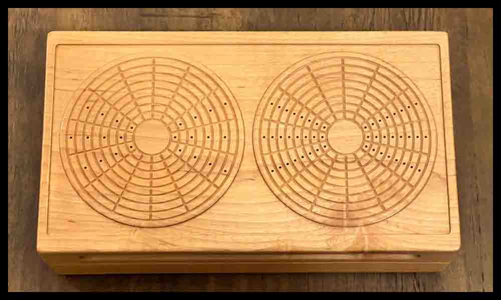 I ended up making two circular chess boards complete with custom designed chessmen and checkers. It was a huge task and took months to complete. The final result, though, is perhaps my best work as far as making gameboards go. To store the game pieces I made two maple wooden boxes that had a top and bottom half that would slide together on four pins. Two set screws were added in the sides to lock the box. They clamped from either side on two more pins in the middle. On the top of the box I engraved two boards, one set up for chess and one for checkers. I was very pleased with how they turned out!