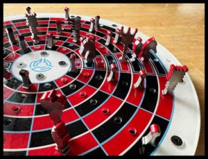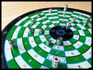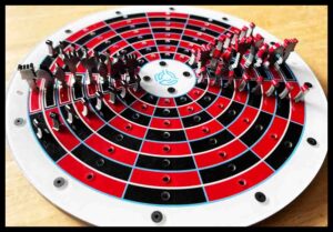 Back in 1990 I just happened to be looking at a chess board. I had played chess just a little when I was younger and was basically a pure novice with no desire to invest the time needed to get better. Anyway, since I was always looking for new games, I began studying the chess board. What if I could turn this into a circle somehow? So I imagined taking the regular board and twisting it into a semicircle that was centered around a smaller circle. Then by mentally drawing a line through the middle of both starting rows I imagined adding the mirror image on to the first semi-circle to form a complete circle. There would be 8 spaces in a row and 14 rows evenly spaced in the circle. Confused? Well, a picture is worth a thousand words! And I’ll post several pics below.