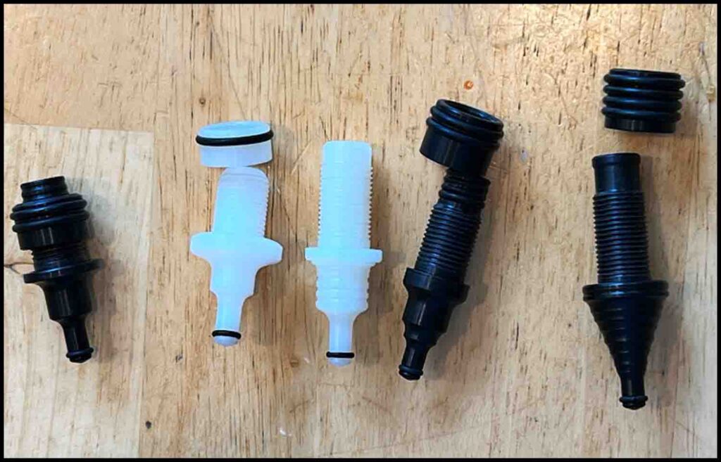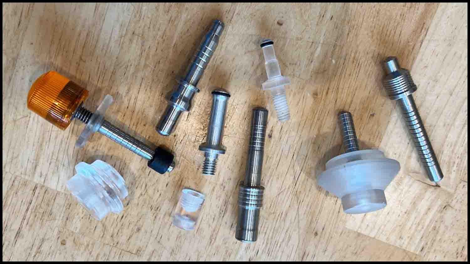 The pictures below show various spindles I have designed over the years. The newest version is on the far left and based on the blueprint shown above. They are made out of nylon (white) and acetal plastic (black). The acetal is extremely easy to machine and is very durable. The two groups of spindles in the middle are made out of acetal, nylon, aluminum, brass, clear plastic rod, and stainless steel. Some use nuts to tighten down the disc on the spindle but others use little rubber washers that press down on the disc. They are easier to make but they don’t work as well. Click on the pictures for a bigger version.