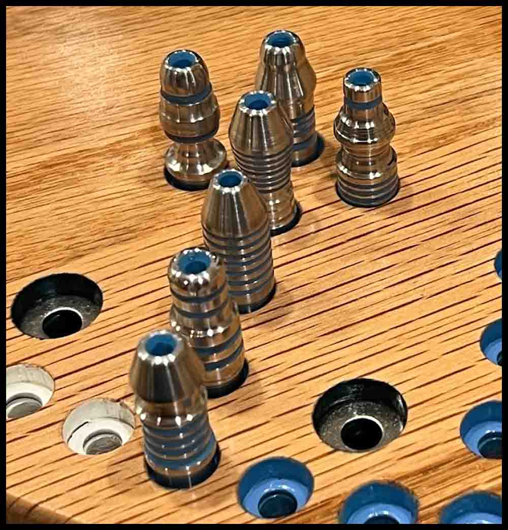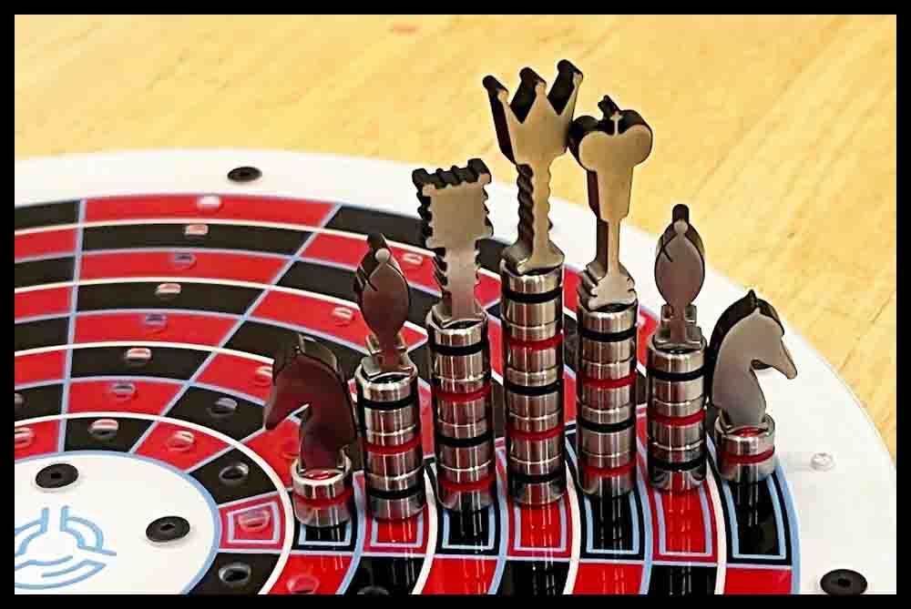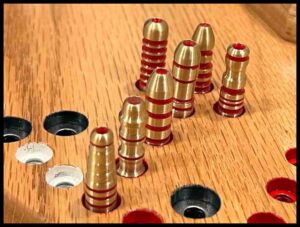 Aggarv8ion and Octosory: For these bigger game boards made out of wood you can use either 16 mm marbles or game pieces made out of 8-32 x 1″ screws with 1/2″ outside diameter flat washers. (If desired, 10-32 screws may be used in the bigger boards. Be sure and use 13/64″ clearance holes instead of 3/16″.)