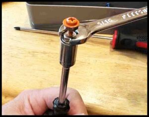 Working with small parts can be challenging. To make the job easier, use a medium size Phillips screwdriver (#2) along with two 11/32″ or 9mm wrenches for 8-32 nuts. One should be open end and the other a box end. Using a socket with a 1/4″ driver will make tightening the bottom nuts easier. I use a small pair of vice grips on the socket driver handle to get a stronger grip. See the pictures below.