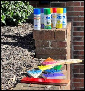 To hold the screws while you spray paint the upper half, drill 8 or more 3/16″ holes about 1/2″ deep in small pieces of scrap wood. The whole screw does not need to be painted. The fastest, easiest way to spray paint many pieces at at time is to take some old cardboard boxes and lay the scrap wood pieces on them when spraying. The flat washers may be grouped away from each other right on top of the cardboard. If you plan on making several different games it is easier to paint them all at once and keep some for future use or spares. Use a decent quality paint that will adhere to the screws and washers. Make sure there is no grease or oil coating on the parts before painting. Let them dry several days before assembling so the paint doesn’t chip.