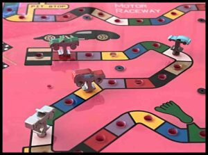 Rainbow Raceway – small version: For a Rainbow Raceway game made from a single 8 1/2″ x 11″ printed image, substitute 6-32 x 1″ stainless round head machine screws and nuts instead of using 8-32 screws. Use 3/8″ outside diameter flat washers. The holes drilled in wooden boards will be 5/32″ diameter instead of 3/16″. The pierced holes in foam poster board will be approximately 11/64″ or .172″.