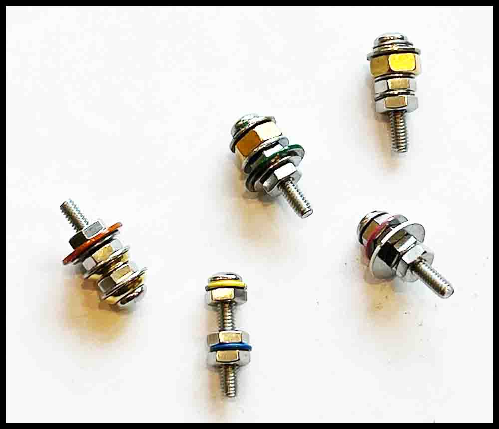 Rainbow Raceway – bigger version: 8-32 x 1″ screws with 1/2″ outer diameter flat washers.